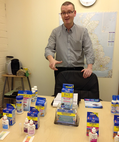 On Friday 9th of May it was Colin’s turn to present the importance of Water testing in the Aquarium. Colin covered the Nitrogen Cycle, the four main areas of testing in freshwater Aq1uariums, being Ammonia, Nitrite, Nitrate and PH. Using API test kits and Treatments as his product of choice Colin provided demonstration to the rest of the team on how to test Aquarium water using both Liquid Test Kits and Strips and providing an explanation on how you would set about correcting any problems you found during a test.